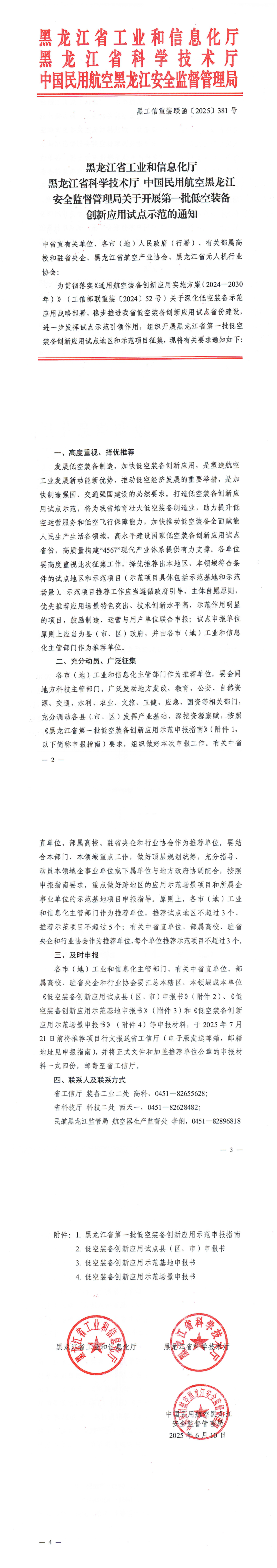 黑龙江省工业和信息化厅 黑龙江省科学技术厅 中国民用航空黑龙江安全监督管理局关于开展第一批低空装备创新应用试点示范的通知